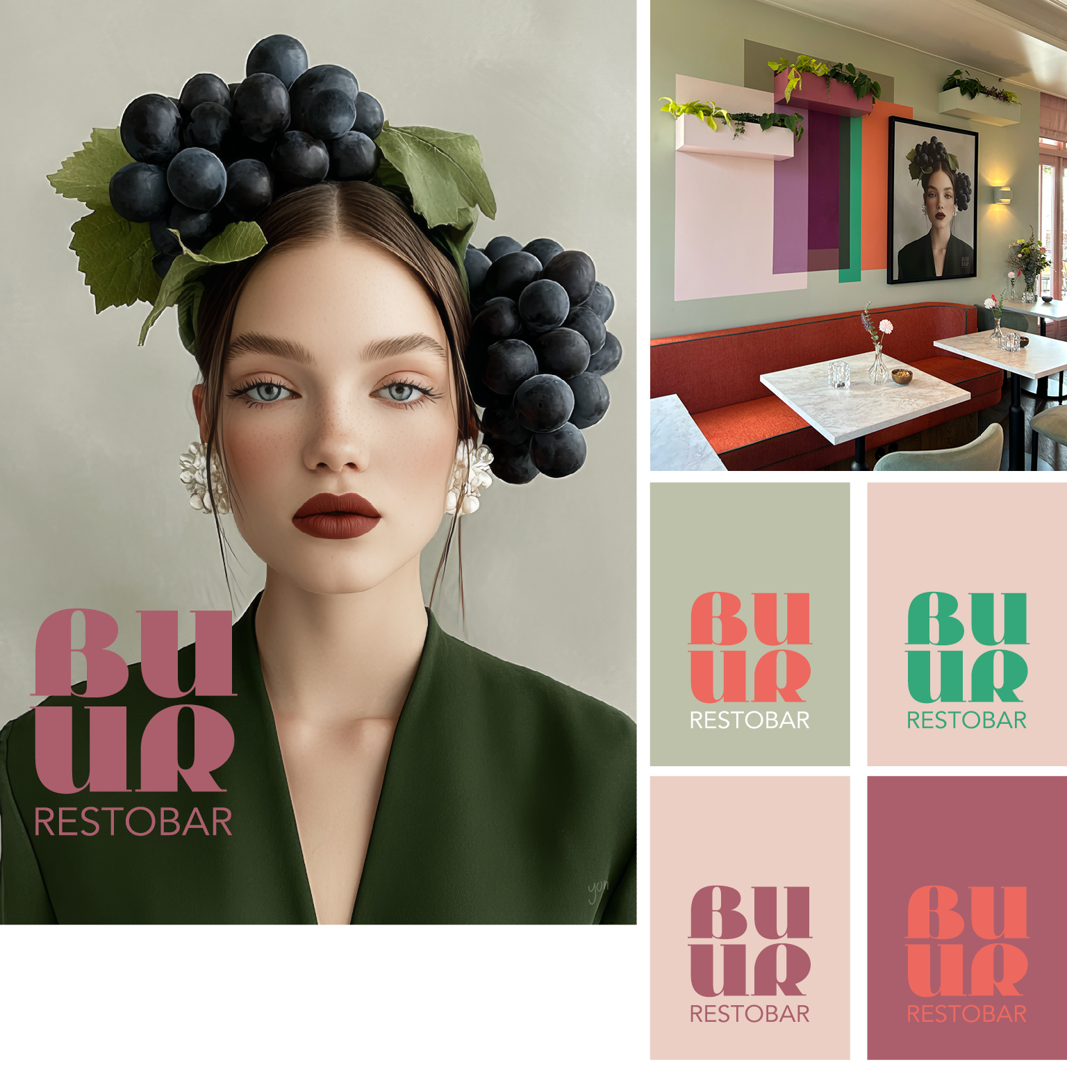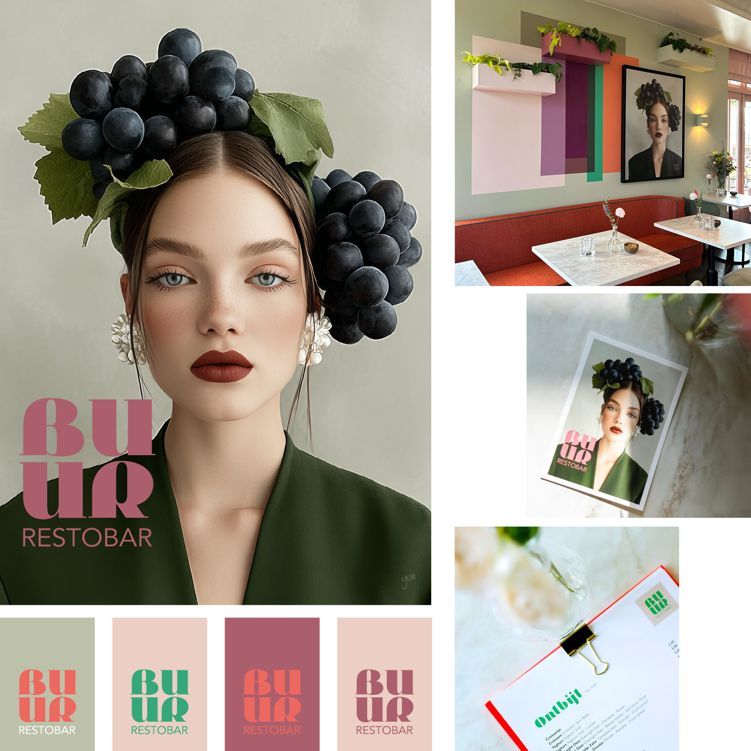 Speciaal voor BUUR heb ik dit beeld gecreëerd. Het heeft een prominente plek gekregen op de wand en vormt, samen met de kleurvlakken en plantenbakken, een sfeervol geheel in het prachtige interieur dat door Marie-Gon en Suzanne (interior design) ontworpen is. Ook het logo en de rest van de branding heb ik mogen ontwerpen. Van Signing tot menukaart.